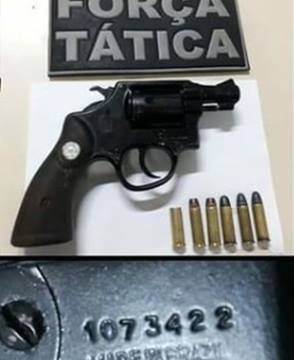 Foram realizadas diligências, na Rua Waldemiro Alcibíades, o policiais realizaram a abordagem ao suspeito identificado como Joscilian Pinheiro de Almeida 33 anos, durante a revista no imóvel do suspeito os policias da FT4 encontraram um _revólver Taurus n° 1073422 calibre .38, com 06 (seis) munições sendo uma deflagrada.