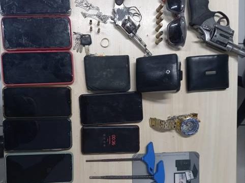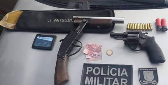 Durante uma busca no veículo foi encontrada uma arma caseira calibre 12 e um Revólver calibre .38. Diante dos fatos os três foram encaminhados para a Delegacia e realizado o procedimento em desfavor dos mesmos.