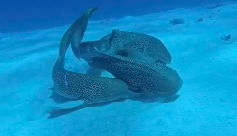 Um vídeo registrou pela primeira vez na natureza um acasalamento entre três tubarões-leopardo (Stegostoma tigrinum), dois machos e uma fêmea, nas águas da Nova Caledônia, território francês no Pacífico. O flagrante foi feito pelo biólogo marinho Hugo Lassauce, da University of the Sunshine Coast, da Austrália, em parceria com o Aquarium des Lagons, localizado em Nouméa, capital do território.