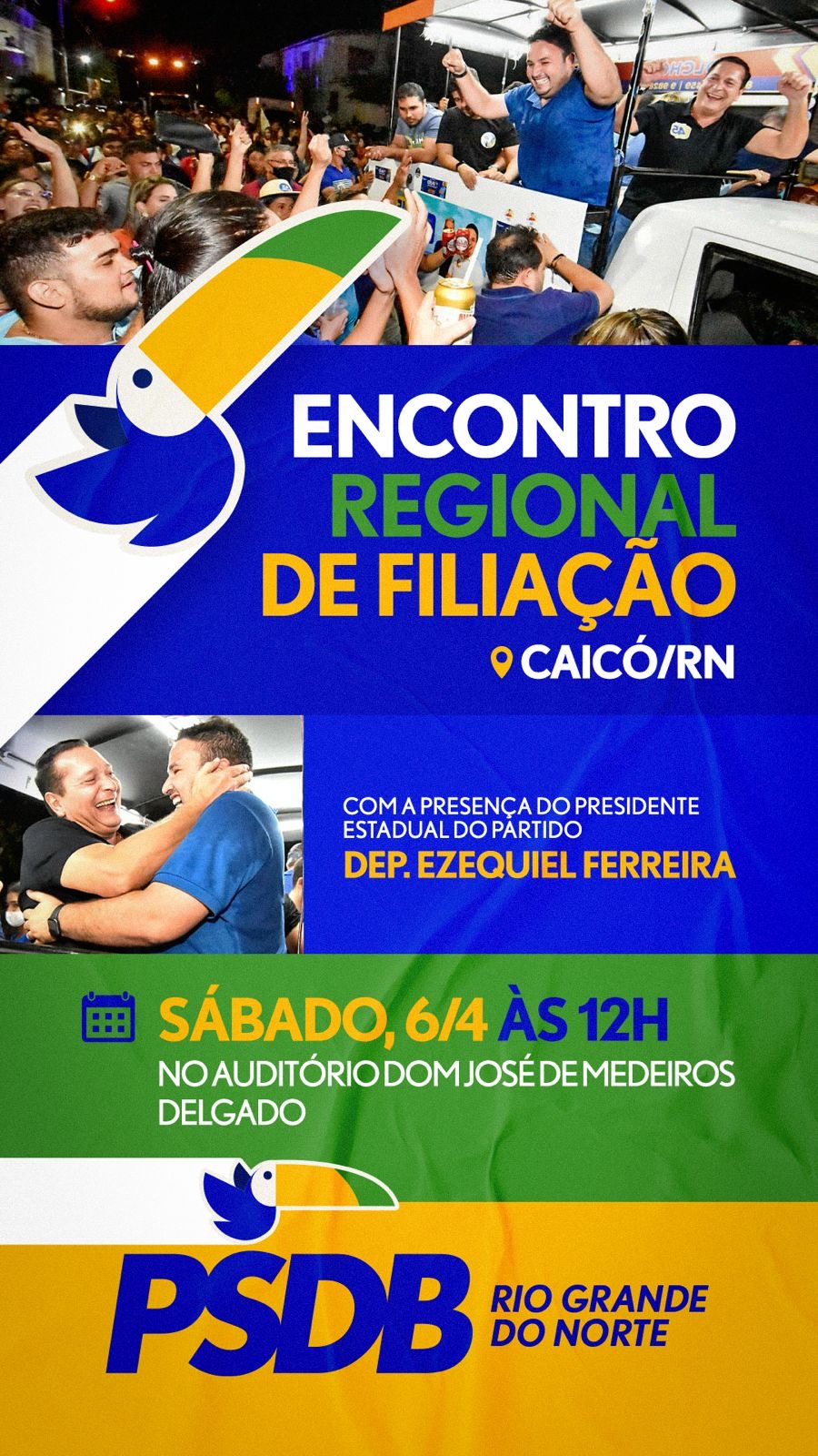 O PSDB Potiguar vai promover neste sábado (6), um Encontro Regional de Filiações. O evento contará com a presença do presidente da Assembleia Legislativa, líder regional da sigla. O encontro será partir das 12h, no auditório Dom José de Medeiros Delgado (Salão da antiga Escola Pré-vocacional). O prefeito Dr. Tadeu, que lidera todas as pesquisas para à reeleição será o anfitrião do encontro.