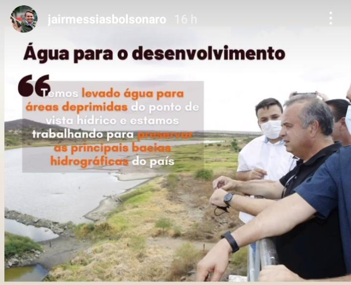 O Presidente Jair Bolsonaro destacou no seu instagram as iniciativas hídricas que o país está tomando para solucionar a questão da seca no país. Usando imagem do Ministro Rogério marinho e do prefeito de Caicó, Dr. Tadeu, o Presidente destacou o Programa Águas Brasileiras.