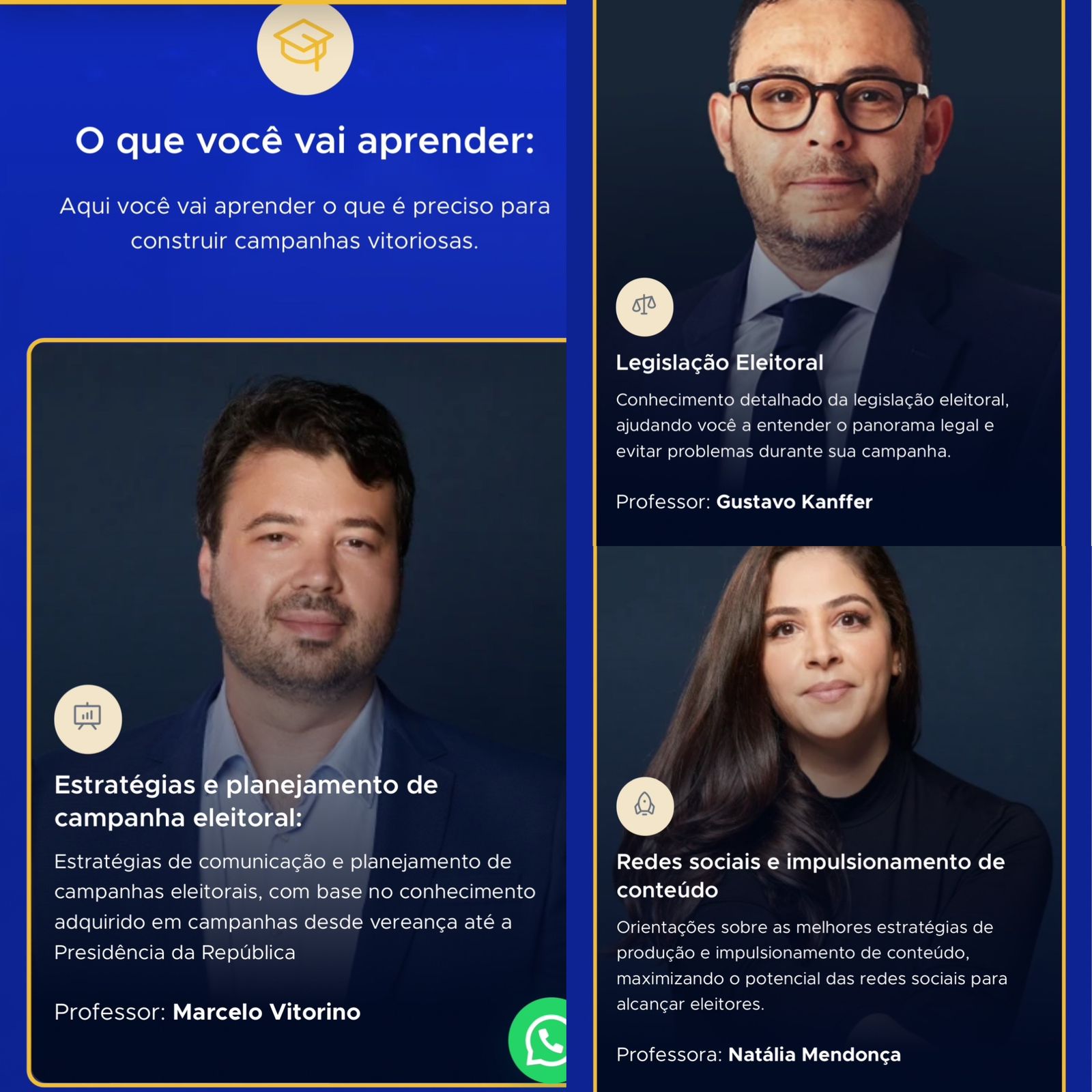 “Serão momentos para falar em estratégias e planejamento de campanha, ministrado pelo professor Marcelo Vitorino, nome de referência no marketing digital. A professora Natália Mendonça vai focar nas Redes sociais e impulsionamento de conteúdo. Já Gustavo Kanffer, advogado com experiência em direito público, eleitoral, partidário, legislativo e atuação no STF, STJ e TSE há 18 anos, discutirá conhecimento detalhado da legislação eleitoral”, explica o jornalista Rodrigo Rafael, diretor do Instituto Teotônio Vilela (ITV), Seção Estadual do Rio Grande do Norte.