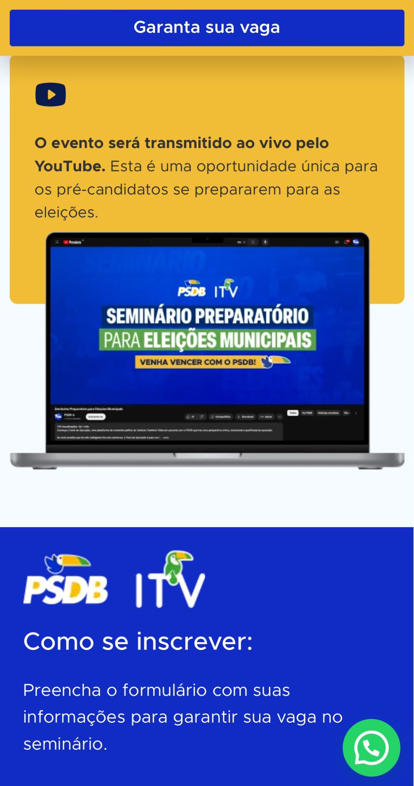 Tudo será online e transmitido pelo You Tube. As inscrições já iniciaram através do link: seminario.itv.org.br . O evento será realizado nos dias 17, 18 e 19 de junho. O seminário será virtual, transmitido pelas redes do ITV e do PSDB, e está previsto para 18h30 às 20h30, aproximadamente. É totalmente focado para quem deseja aprender as melhores estratégias de comunicação para uma campanha eleitoral.