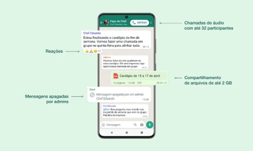 O aplicativo agora permitirá que grupos de bate-papo tenham até 1.024 usuários, muito acima da restrição anterior de 256 participantes ( ainda válida para o Brasil), de acordo com um comunicado da empresa. Isso alinha o Whatsapp a seus principais concorrentes, Telegram e Discord, permitem milhares de membros em chats em grupo.