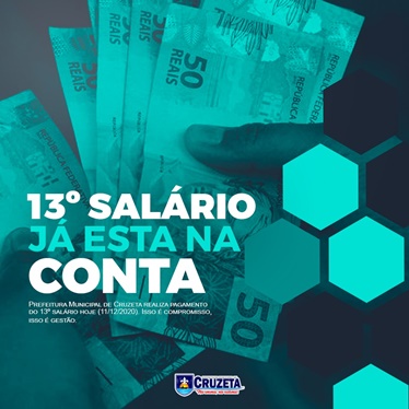 Os servidores municipais de Cruzeta receberão, hoje, (11 de dezembro) o 13º salário, o pagamento já esta disponível na conta dos servidores e reforça o compromisso do prefeito Sally Araújo com o funcionalismo público municipal.