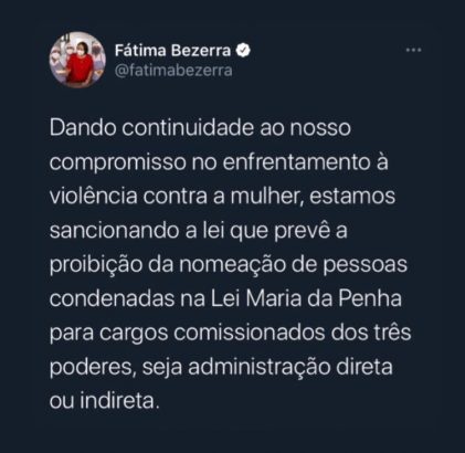 Uma nova lei sancionada pelo Governo do Estado do Rio Grande do Norte proíbe que agressores de mulheres condenados pela Lei Maria da Penha sejam nomeados em cargos da administração pública direta e indireta.