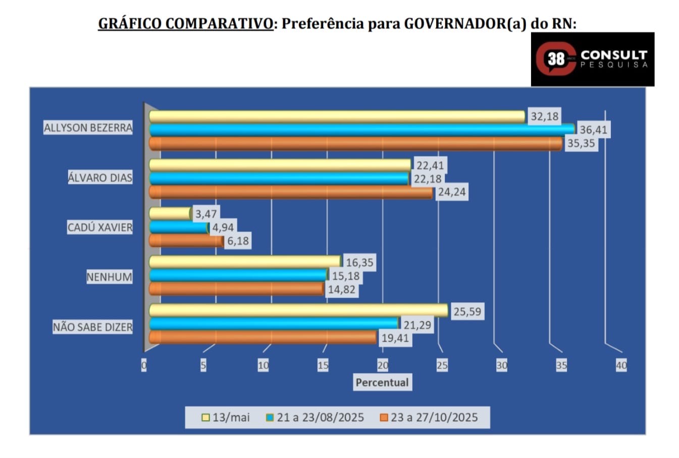 A Consult também questionou os eleitores sobre o cenário onde o ex-prefeito de Natal, Álvaro Dias (Republicanos), substitui o senador Rogério Marinho. Nessa situação a liderança é de Allyson Bezerra com 35,35%, enquanto Álvaro surge com 24,24% e Carlos Eduardo Xavier 6,18%. Nenhum teve 14,82%, e 19,41% não souberam dizer.