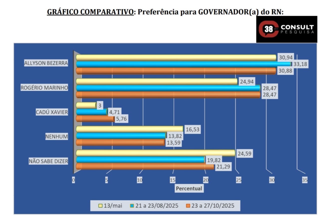 A terceira pesquisa da Consult publicada pela Tribuna do Norte este ano aponta um cenário de bastante equilíbrio. Segundo os números, o prefeito de Mossoró Allyson Bezerra (União), viu sua vantagem sobre o senador Rogério Marinho cair para apenas 2,4% – em maio a diferença era de 6 pontos percentuais e em agosto de 4,71 pontos. O resultado atual configura empate técnico, com a menor diferença da série a pouco menos de um ano do pleito de 2026.