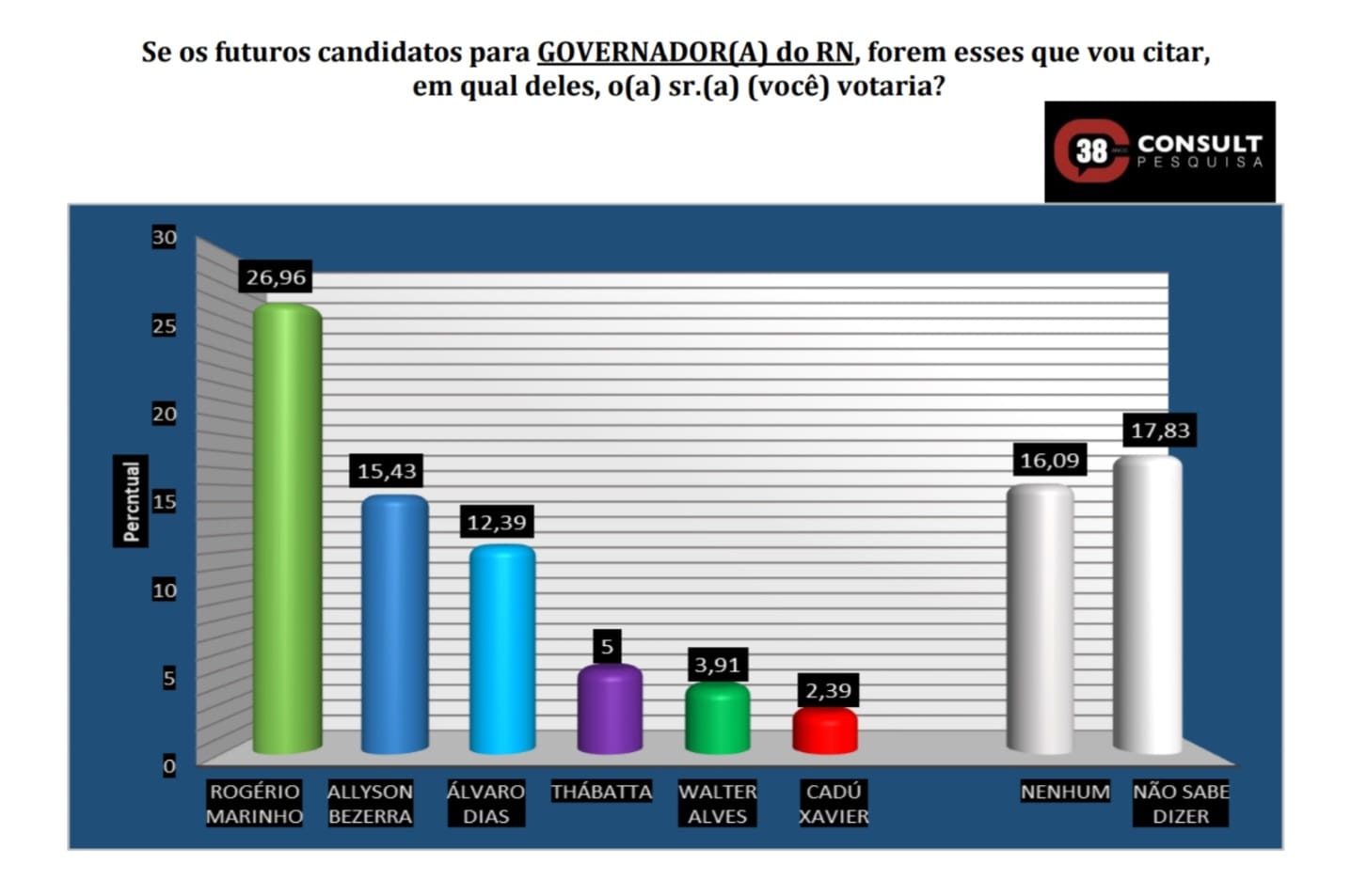Consult: Rogério tem 26,96%, Allyson 15,43% e Álvaro 12,39% em Extremoz