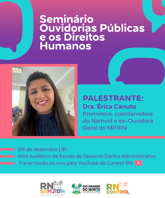 Com o início marcado para às 9h, o evento terá duração de 2h, encerrando-se às 12h30min. O objetivo é reunir ouvidores e profissionais de áreas afins para qualificar o atendimento à população e aperfeiçoar as abordagens com foco nos direitos humanos. A explanação sobre essa temática, será realizada pela Dra. Erica Canuto, Promotora do MPRN/Coordenadora Núcleo de Apoio à Mulher Vítima da Violência Doméstica, Ex-Ouvidora do MP/RN.