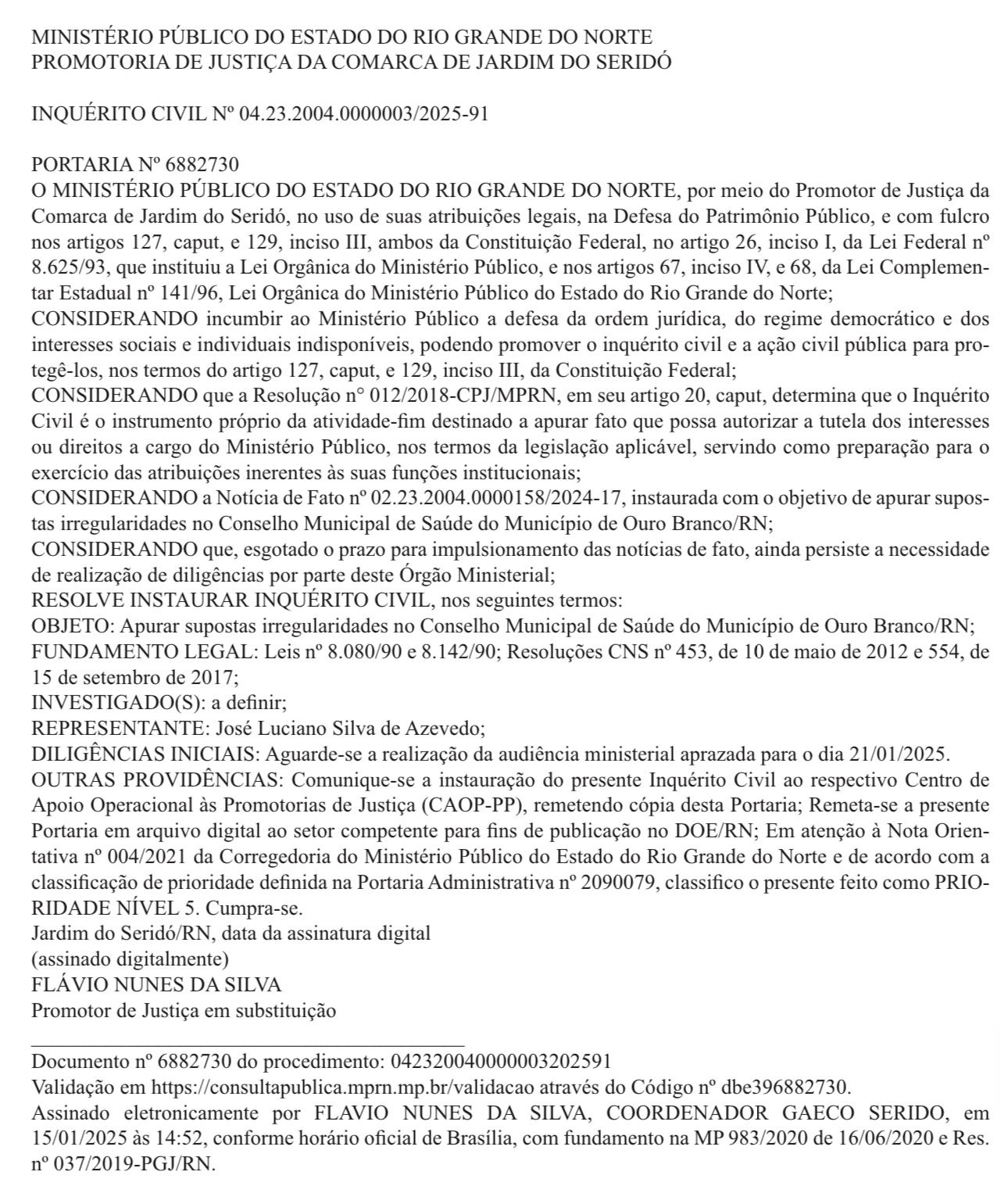 Coordenador do Grupo de Atuação Especial de Combate ao Crime Organizado (Gaeco) da região Seridó, promotor de Justiça, Flávio Nunes da Silva abriu inquérito no âmbito do Ministério Público do Estado para apurar supostas irregularidades no Conselho Municipal de Saúde de Ouro Branco. Uma audiência foi realizada nesta terça-feira (21), mas nada vazou.