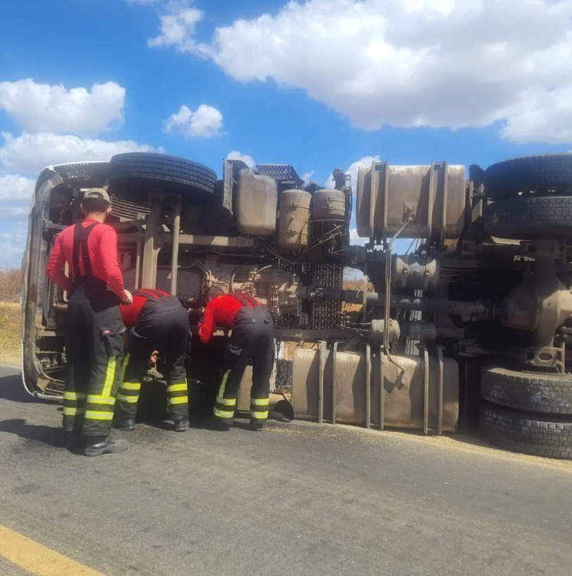 Corpo de Bombeiros realiza contenção de óleo após capotamento de carreta na BR-405, em Apodi