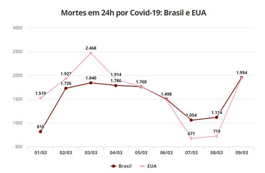 O Brasil ultrapassou, na terça-feira (9), os Estados Unidos em número de mortes registradas em 24h por causa da Covid-19. De acordo com o consórcio de veículos de imprensa, 1.954 brasileiros morreram por Covid-19 em apenas um dia. Entre os americanos, foram 1.947 mortes, segundo dados do “Our World in Data”, da Universidade de Oxford. Não é a primeira vez em que o Brasil passa os EUA em número de óbitos. Isso vem acontecendo nos últimos 5 dias.