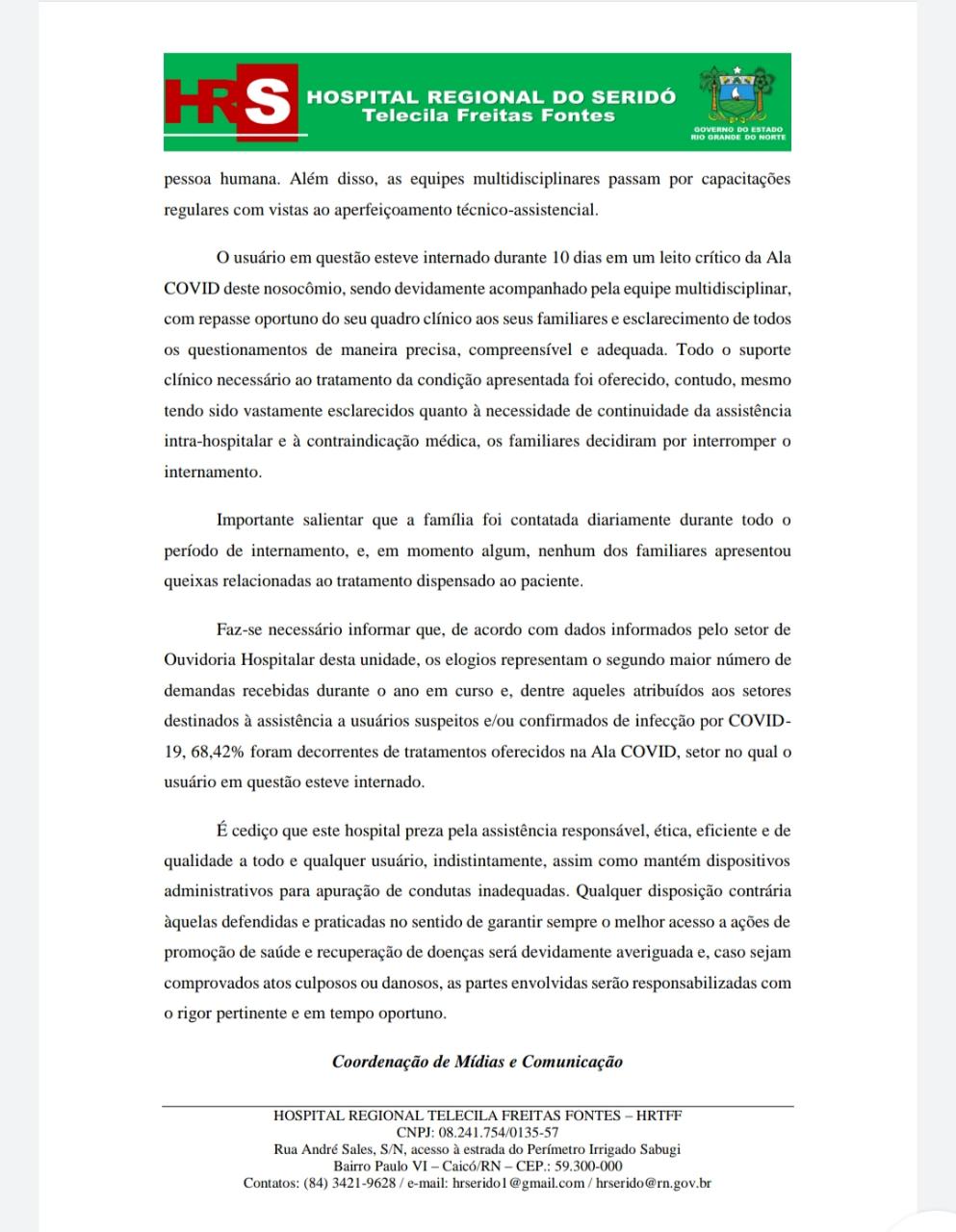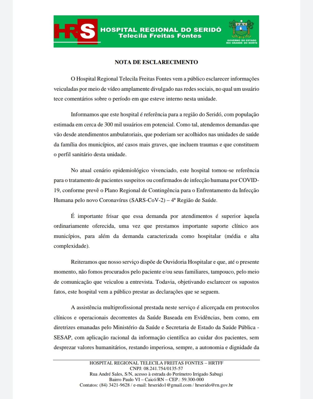 Circula um vídeo nas redes sociais em que um repórter invoca a fala de um ex-paciente do Hospital Regional do Seridó, possivelmente na tentativa de arranhar a imagem de uma unidade de saúde que é referência no combate à Covid-19 no Seridó.