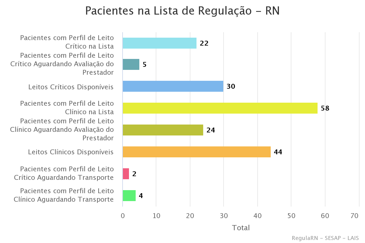 Neste período, havia 22 pacientes com perfil para leitos críticos na lista de regulação e cinco (05) aguardavam avaliação. Foram registrados disponíveis 30 leitos críticos e outros 44, sendo clínicos.