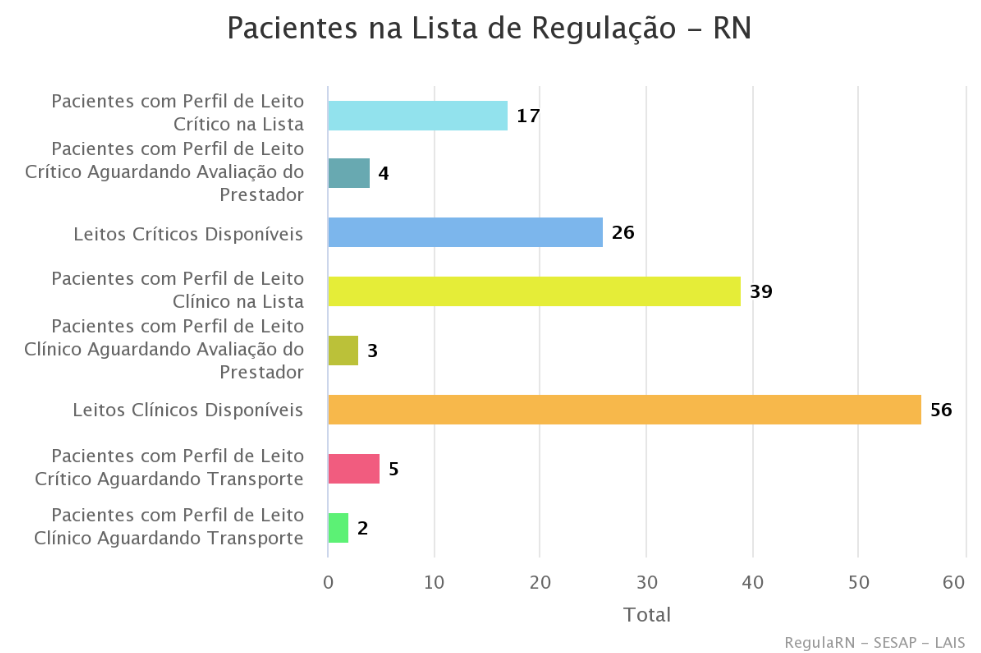 Neste período, haviam 17 pacientes com perfil para leitos críticos na lista de regulação e 4 aguardavam avaliação. Foram registrados disponíveis 39 leitos críticos e outros 56, sendo clínicos.