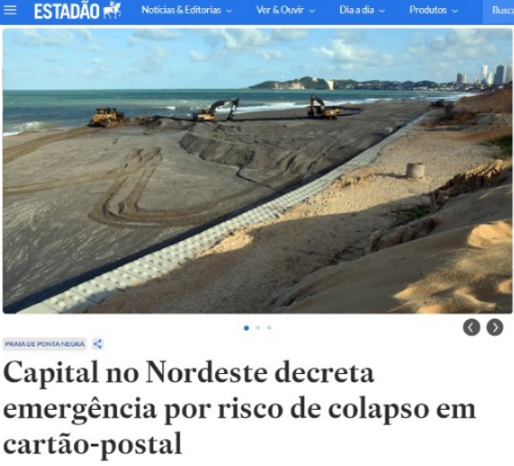 “Os principais cartões-postais de Natal, o Morro do Careca, na praia de Ponta Negra, e a Via Costeira, que se estende de leste a sul da cidade, estão sofrendo processo erosivo considerado crônico por especialistas. Na última semana, o avanço das marés acima do normal levou a capital potiguar a decretar emergência por 90 dias”, apontou o texto da matéria, assinado pelo jornalista Ricardo Araújo.