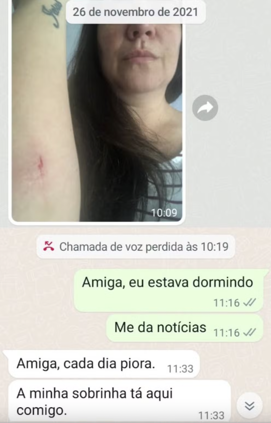 Em uma das conversas, ocorridas em 26 de novembro de 2021, a delegada Juliana primeiro envia foto de uma agressão que sofreu e depois escreve: “Amiga, cada dia piora”. Depois, em 2022, a policial conta que conversou com o filho sobre as agressões que vem sofrendo e a seguir, desabafa: