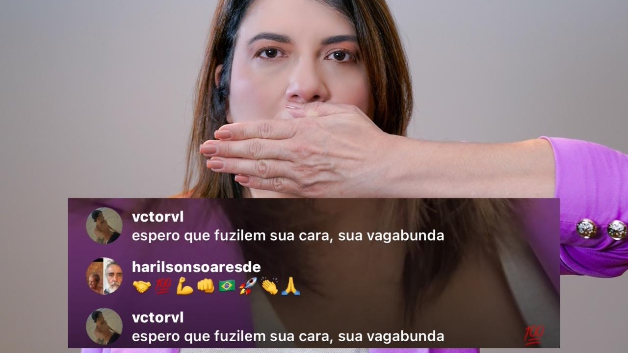 O ataque partiu de um perfil identificado como Victor Teixeira, que acompanhava a live e publicou repetidamente a seguinte mensagem: “Espero que fuzilem sua cara, sua vagabunda.”
