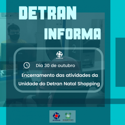 O Departamento Estadual de Trânsito do RN (Detran) informa que a partir desta sexta-feira (30), encerrará as atividades na unidade do órgão localizada no Natal Shopping, em Natal-RN.