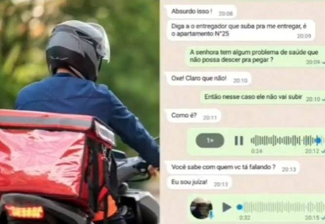 “Eu não vou pedir para o entregador subir até o seu apartamento. Eu conheço seu prédio, seu apartamento fica no quarto andar. A senhora quer que eu peça para o entregador subir quatro vãos de escada? Ele é entregador, não é seu garçom não”, continuou.