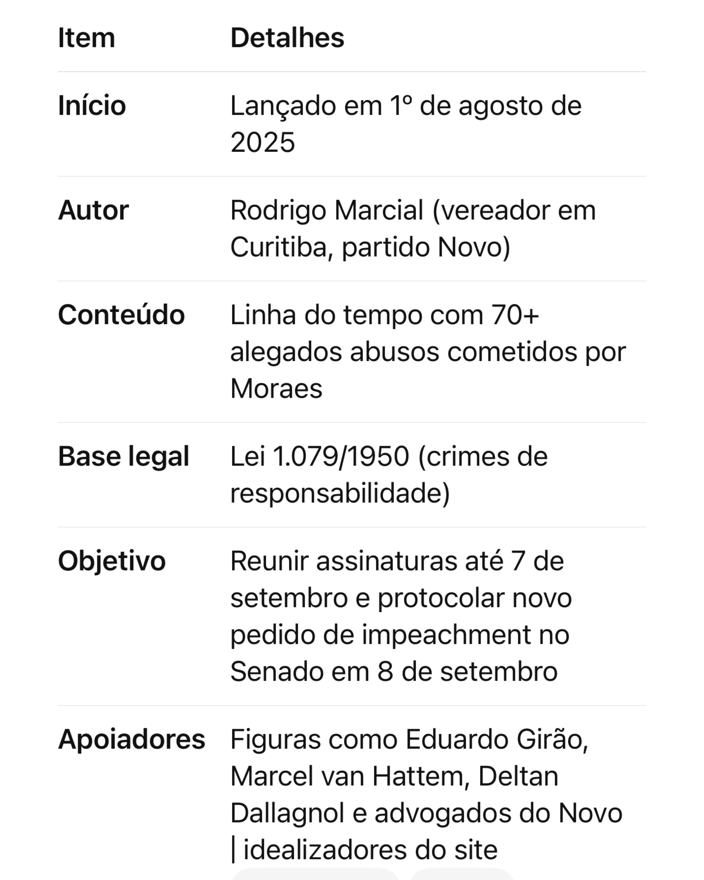 A matéria ainda informa que o projeto conta com o apoio de figuras públicas como o senador Eduardo Girão e o deputado Marcel van Hattem, que também têm protocolado pedidos formais de impeachment .