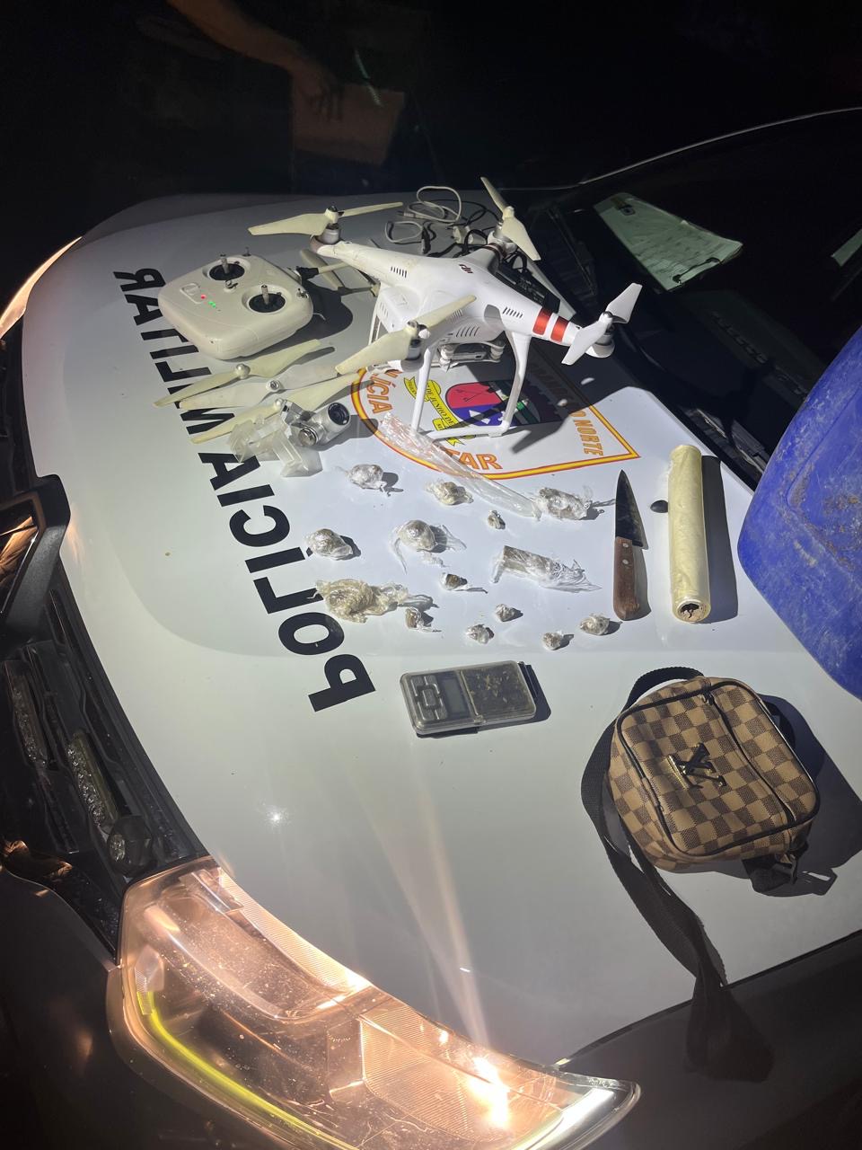 Ainda de acordo com o comandante da GU, além do drone, “foram apreendidos 14 porções de maconha, pesando aproximadamente 100gramas, 01 balança de precisão, 01 rolo de papel filme, 01 faça peixeira e uma pochete de cor marrom com preto”, finalizou.