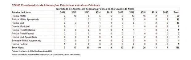 Ainda de acordo com os dados da Coine, entre 2011 e 2020, morreram 126 agentes públicos da segurança, entrando na contagem policiais penais tanto estadual quanto federal e Polícia Federal. Sendo, portanto, os anos de 2012, 2017 e 2018 os que obtiveram mais baixas. Em 2012 foram 17 mortos, em 2017 morreram 21 e em 2018, foram 26 assassinatos.