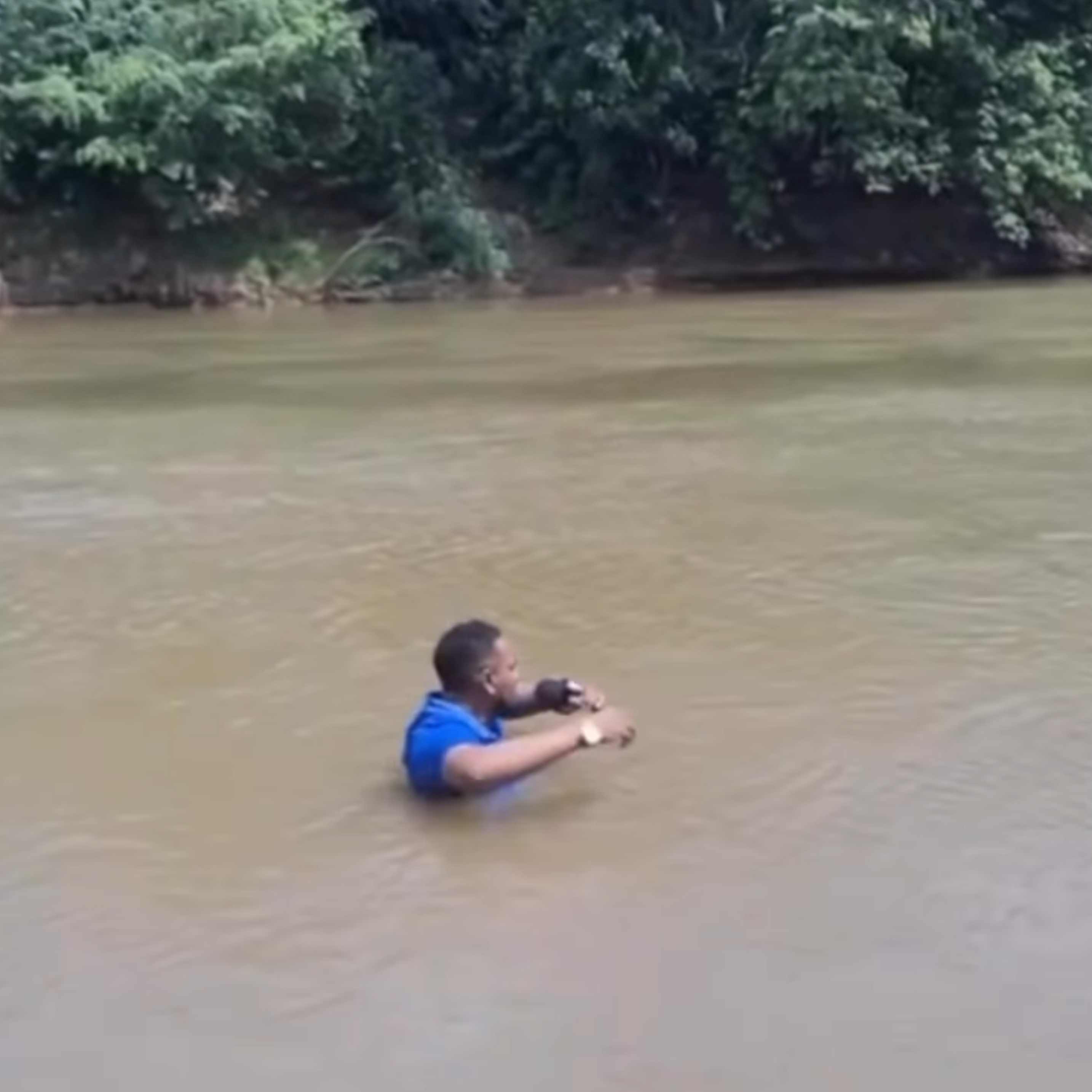 No vídeo, Lenildo caminha dentro do rio para mostrar a profundidade, quando foi pego de surpresa ao pisar acidentalmente no corpo. “Eu acho que tem um negócio aqui no fundo da água. Era mole. Será que né ela não?”, disparou ele após se assustar.