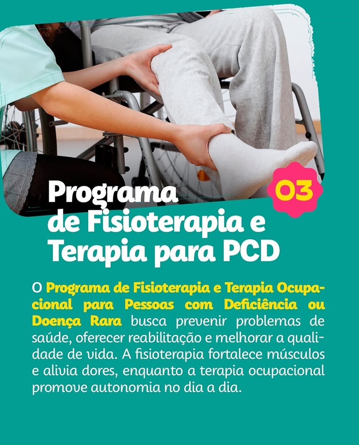 O Programa de Fisioterapia e Terapia Ocupacional para Pessoas com Deficiência ou Doença Rara busca prevenir problemas de saúde, oferecer reabilitação e melhorar a qualidade de vida. A fisioterapia fortalece músculos e alivia dores, enquanto a terapia ocupacional promove autonomia no dia a dia.