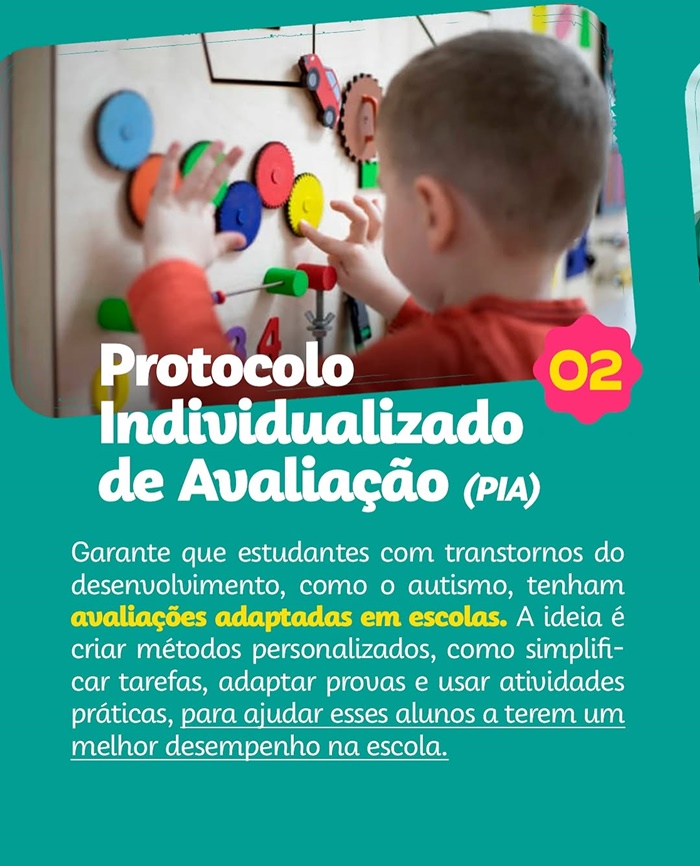 Um outro PL importante de inclusão obrigado as escolas façam avaliações adaptadas para alunos com transtornos do desenvolvimento, como o autismo, por exemplo.