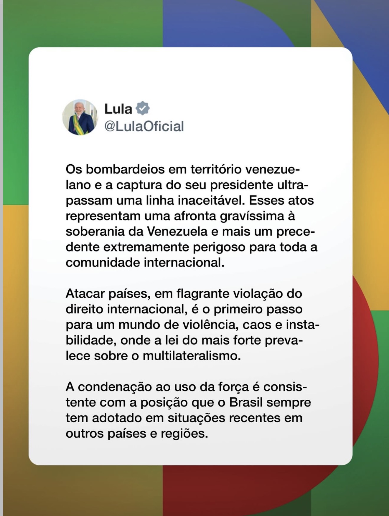 Os bombardeios em território venezuelano e a captura do seu presidente ultrapassam uma linha inaceitável. Esses atos representam uma afronta gravíssima à soberania da Venezuela e mais um precedente extremamente perigoso para toda a comunidade internacional.