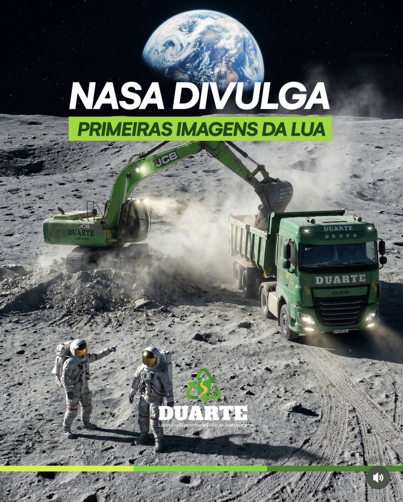 A publicação, feita pelo grupo Duarte, mistura tecnologia espacial com o cotidiano da construção civil. Na imagem, máquinas pesadas da empresa aparecem “trabalhando” na superfície lunar, ao lado de astronautas, em uma montagem que simula uma operação de terraplanagem no satélite natural da Terra.