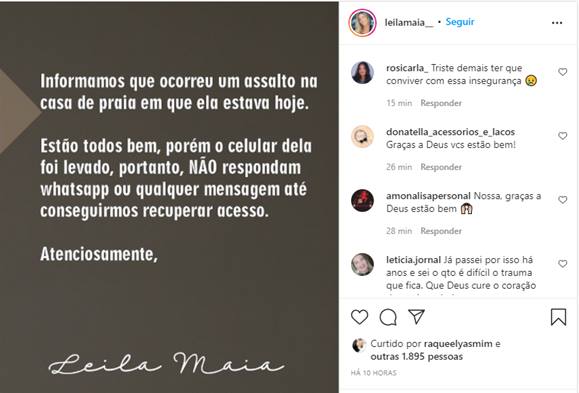 Em sua conta no Instagram, Leila Maia informou sobre o assalto e disse que todos estavam bem. Até o momento, nenhum criminoso foi preso e os pertences não foram recuperados.