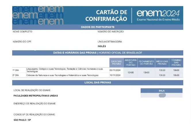 O que é cartão de confirmação? É o documento em que o candidato pode consultar o local de prova. Lá, também estarão escritos o idioma escolhido para a prova de língua estrangeira (inglês ou espanhol), as datas do exame e as solicitações de atendimento especializado (no caso de pessoas com deficiência ou lactantes, por exemplo) e de tratamento por nome social.