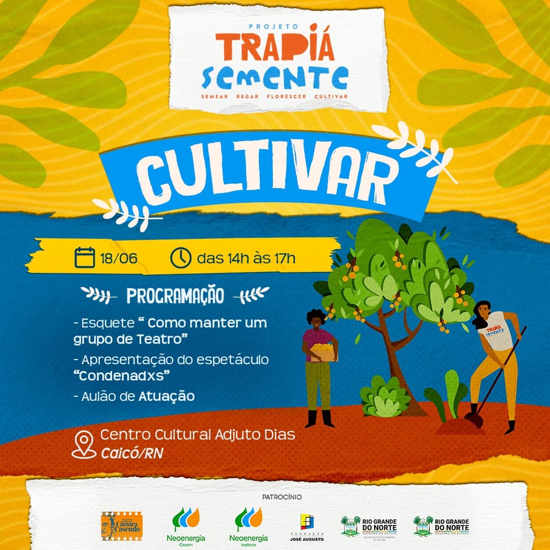 O Projeto Trapiá Semente, da Associação Cultural Trapiá, realiza no Centro Cultural Adjuto Dias, dia 18, das 14h às 17h, o evento CULTIVAR, que reúne todos os grupos de teatro, já formados pelo Projeto Trapiá Semente desde 2022.