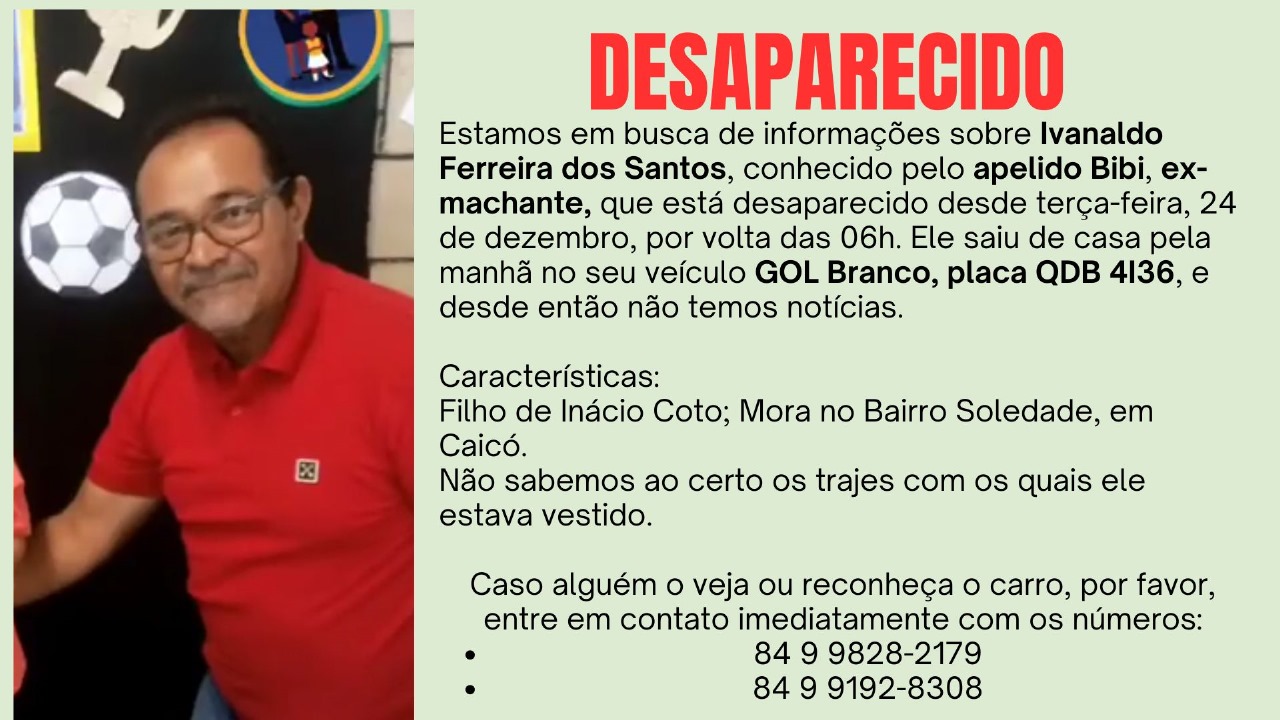 Ex-machante está desaparecido desde a véspera de natal em Caicó