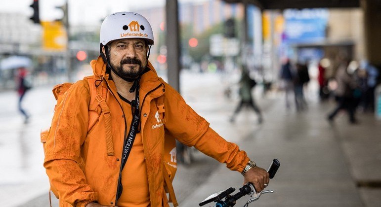 No Afeganistão, era ministro do governo. Agora, na Alemanha, Sayed Sadaat ganha a vida de bicicleta, entregando comida em domicílio.