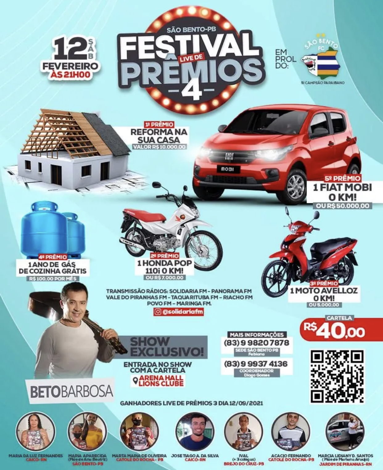 O festival de prêmios ocorrerá dia 12 de fevereiro às 21 horas na Arena Hall do Lions Clube de São Bento. Mais uma edição do sorteio que é sucesso na região. Festival Live de Prêmios, desta vez em prol do São Bento Futsal Clube.