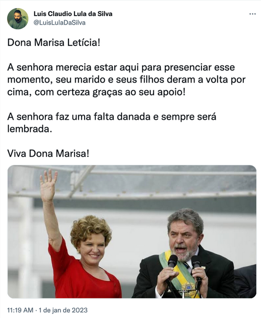 O filho mais novo do presidente eleito Luiz Inácio Lula da Silva (PT), Luís Cláudio Lula da Silva, 37 anos, publicou uma homenagem para a mãe, a ex-primeira-dama Marisa Letícia, neste domingo (1º.jan.2023), momentos antes da 3ª cerimônia de posse do petista.
