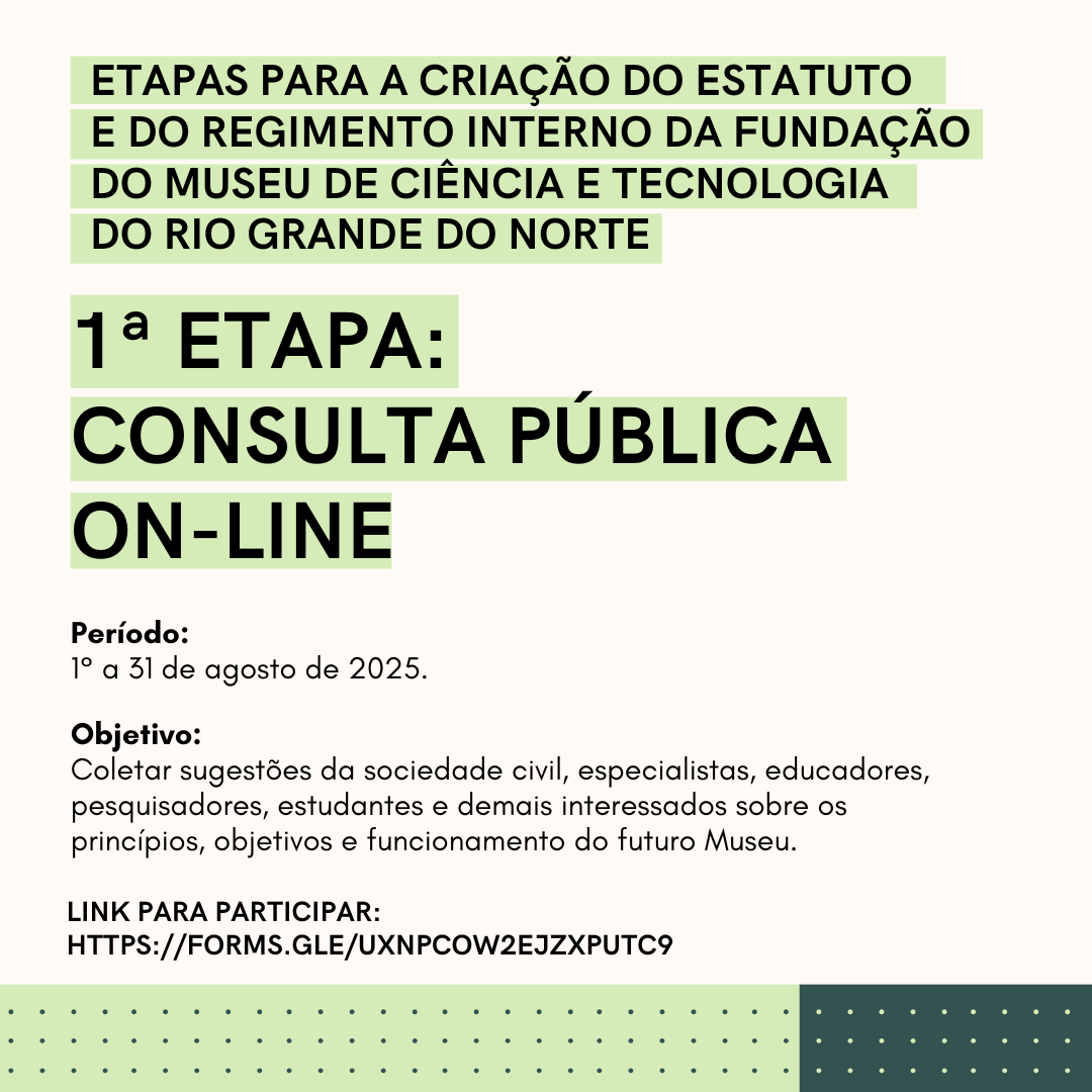 A Fundação do Museu de Ciência e Tecnologia do Rio Grande do Norte iniciou a 1ª etapa do processo de criação do seu Estatuto e Regimento Interno, com uma consulta pública on-line aberta à sociedade, que ficará disponível de 1º a 31 de agosto de 2025.