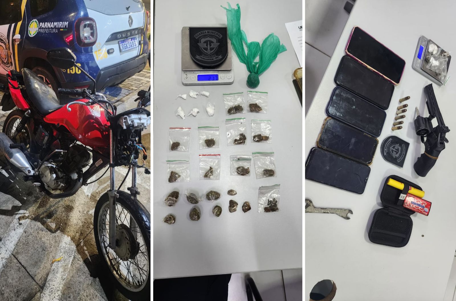 Seguindo rastros de sangue, os guardas localizaram um apartamento com a porta aberta. No local, encontraram o autor do roubo ferido e mais dois indivíduos. Durante a abordagem, foi constatado que além da arma utilizada no roubo, também estavam presentes drogas e outros materiais ilícitos. Todos os envolvidos foram conduzidos à 3ª Delegacia de Plantão – Parnamirim para a realização dos procedimentos legais.