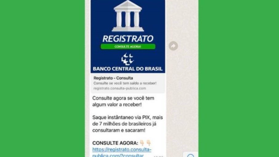 Usando elementos visuais e termos como “registrato” no nome do domínio, golpistas aproveitam a tendência de interesse pelo tema para tentar atrair usuários para sites falsos, que podem infectar o seu dispositivo com um vírus, malwares, roubar dados e até convencer a vítima a enviar dinheiro. Parte da mensagem que leva para o site falso diz: “Consulte agora se você tem algum valor a receber! Saque instantâneo via pix, mais de 7 milhões de brasileiros já consultaram e sacaram!”.Continua após a publicidade