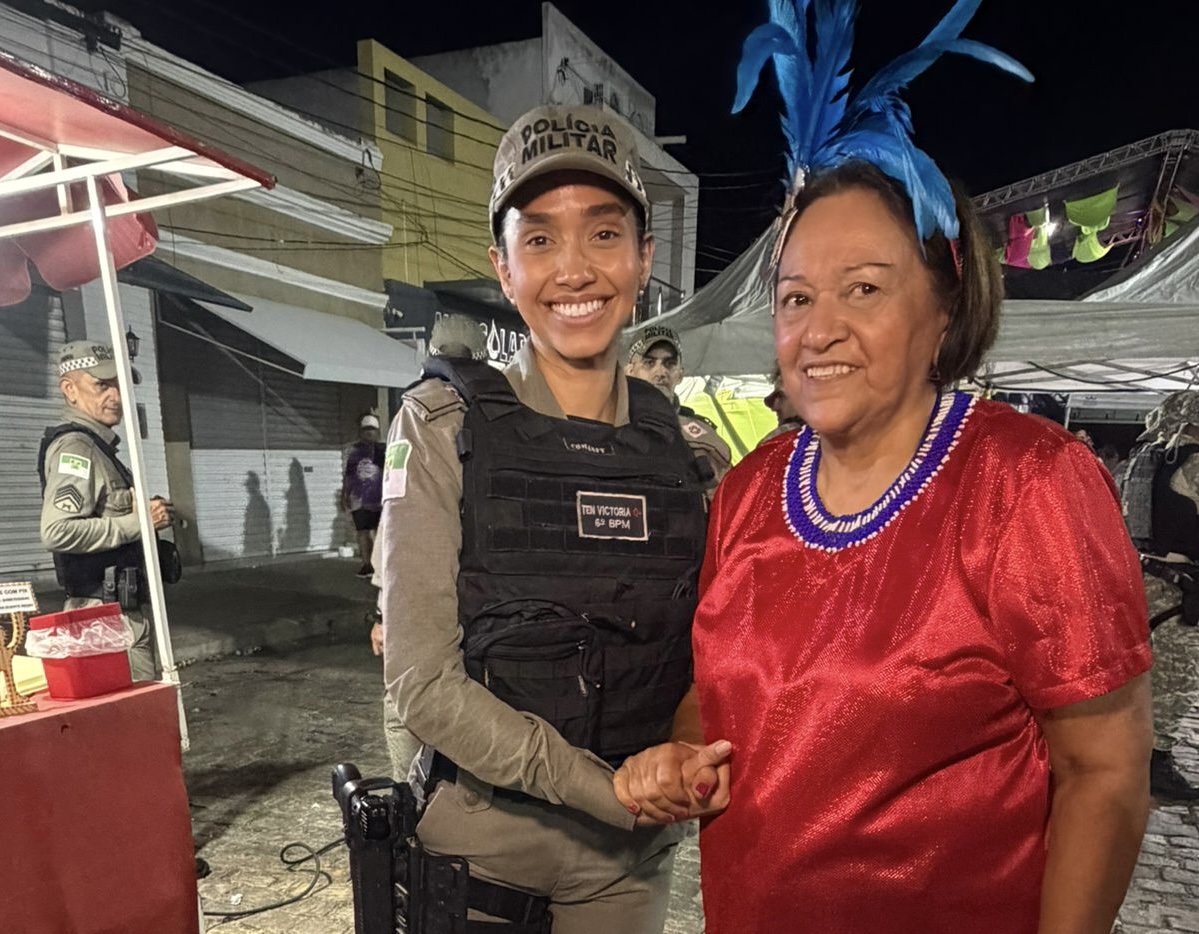 Durante agenda no Carnaval de Caicó, a governadora Fátima Bezerra encontrou a tenente Vitória, que está à frente do comando da tropa responsável pela segurança da festa. Na ocasião, a chefe do Executivo estadual destacou a satisfação em ver uma mulher exercendo função de liderança dentro da corporação, ressaltando que, desde o início da sua gestão, tem buscado valorizar as forças de segurança pública, com atenção especial ao fortalecimento da participação feminina.