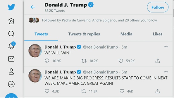 O presidente americano Donald Trump publicou, no Twitter, que sua equipe está fazendo um “grande progresso” e que os resultados das eleições começarão a ser divulgados na próxima semana. “Nós vamos vencer”, escreveu em sua conta no Twitter.