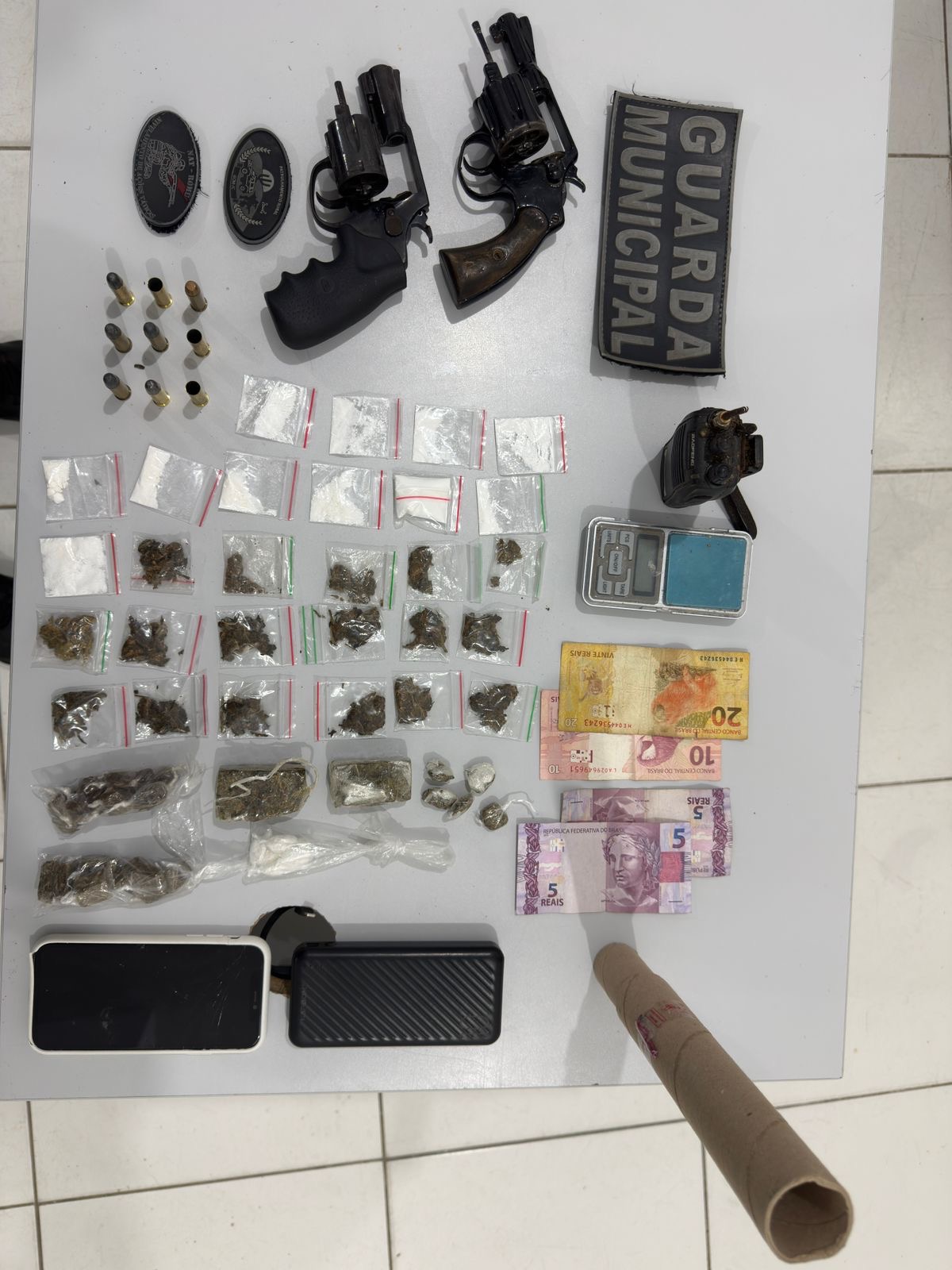 Na ocorrência, os agentes apreenderam dois revólveres calibre .38, munições e uma vasta quantidade de entorpecentes. O material foi apresentado na Delegacia de Plantão de Parnamirim para os procedimentos cabíveis.