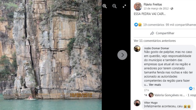 O médico Flávio Freitas, de 52 anos, passeava em seu barco pelo lago de Furnas, em Capitólio (MG), em 2012, quando se deparou com uma fratura chamativa em um dos cânions da região e resolveu fazer um registro. Em suas redes sociais, publicou na ocasião: “Essa pedra vai cair”. Quase uma década depois, ele compartilhou novamente a imagem, e o post viralizou após o desabamento parcial de um paredão do local neste sábado, que deixou ao menos oito mortos e mais de 30 feridos.