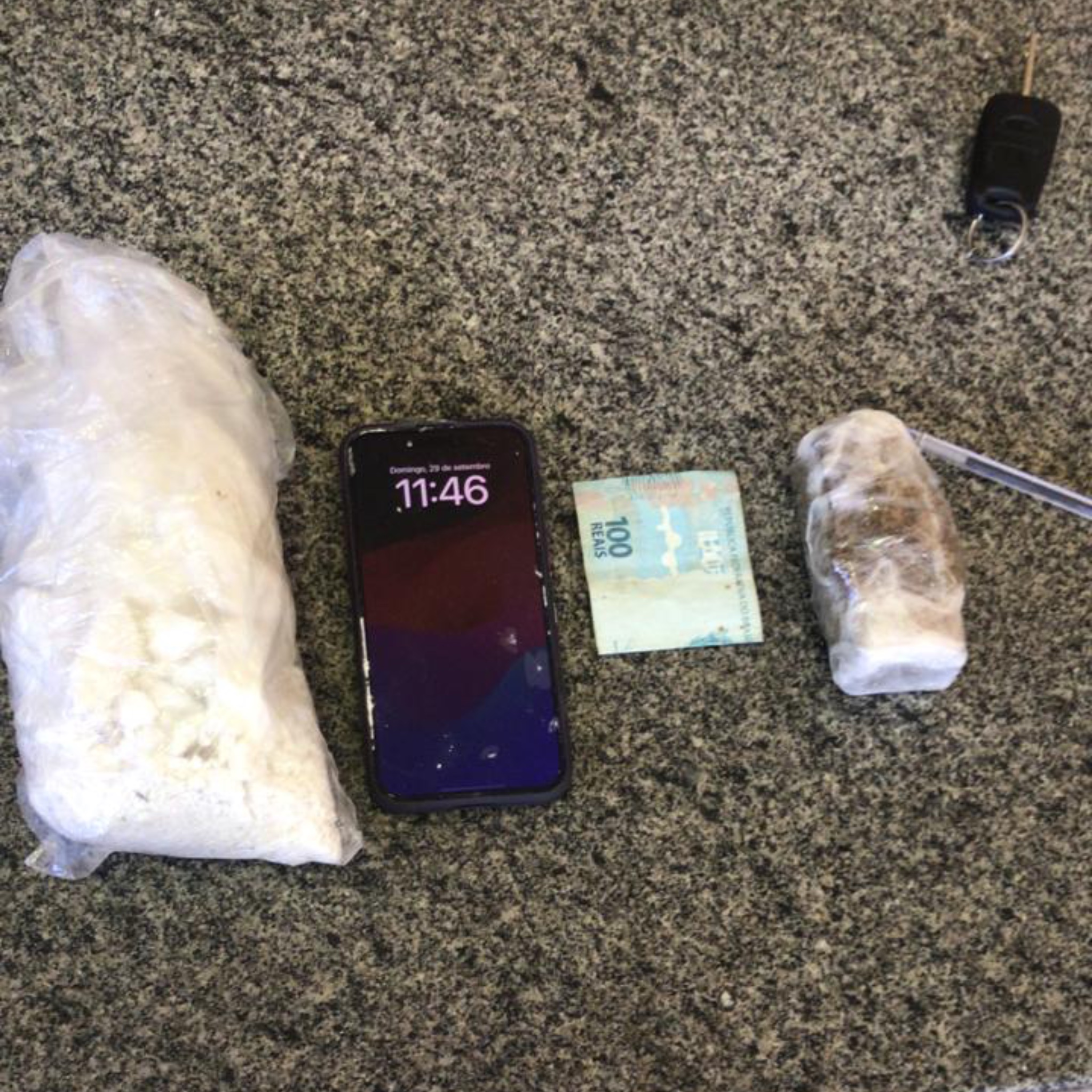 Na busca, foram encontradas 107g de maconha e 458g de cocaína. O acusado e o material apreendido foram encaminhados à delegacia para os devidos procedimentos.