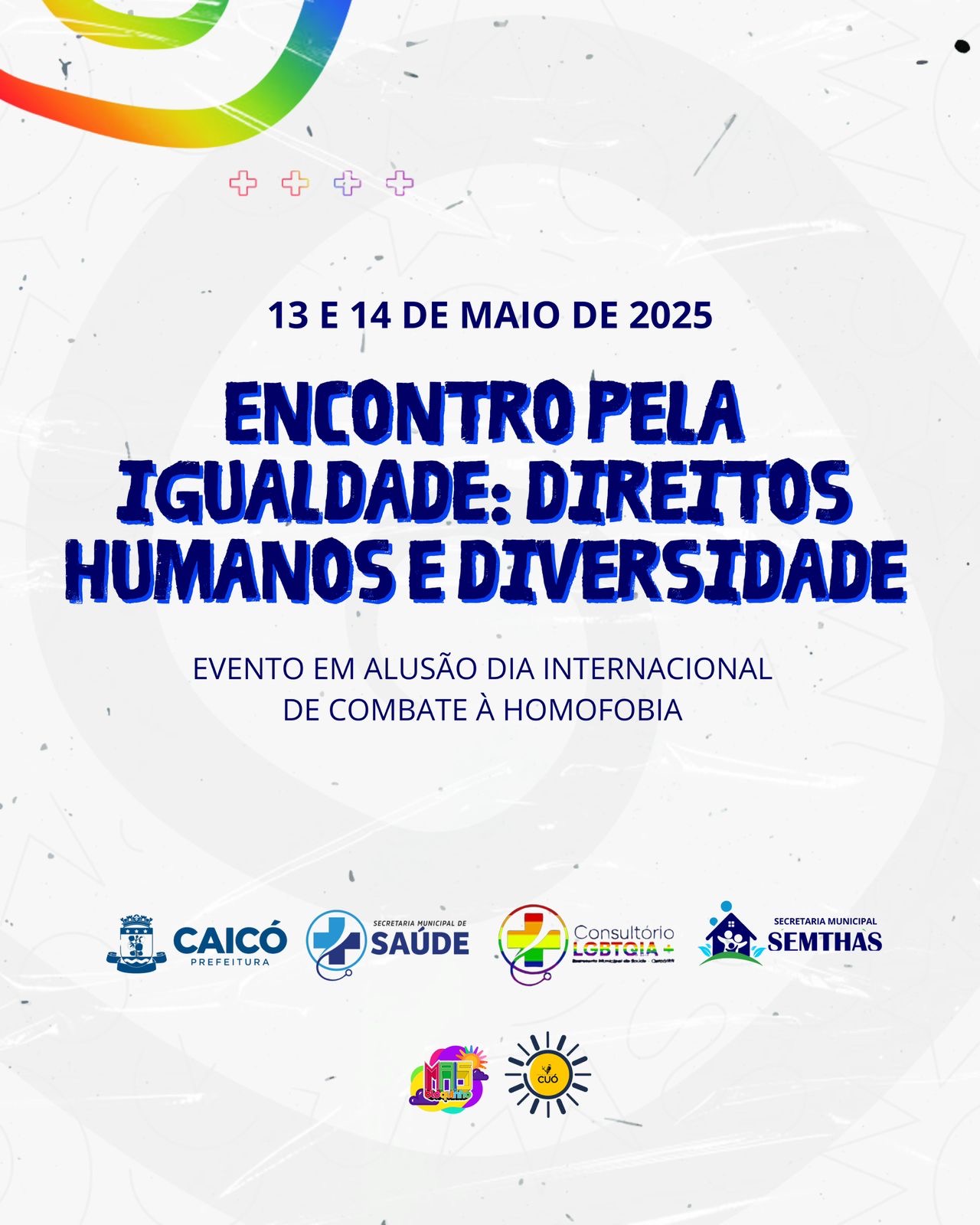 Em alusão ao Dia Internacional de Combate à LGBT+fobia, comemorado em 17 de maio, será realizado nos dias 13 e 14 de maio, em Caicó, o I Encontro pela Igualdade: Direitos Humanos e Diversidade, um evento que propõe reflexão, conhecimento e fortalecimento das políticas de inclusão e respeito à população LGBTQIAP+.
