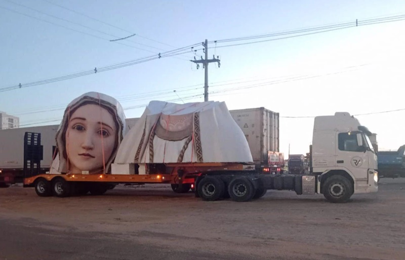A expectativa é que as carretas entrem na cidade entre 10 hs e 12 hs e seguem pra o local onde será descarregada no Complexo de Veneração a Nossa Senhora de Fátima, lá haverá também uma réplica da Capelinha das Aparições existente em Fátima, Portugal.